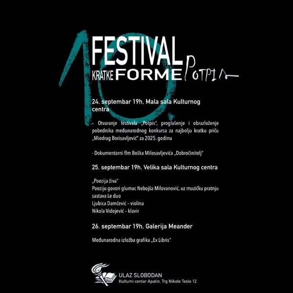 Културни центар Апатин ове године организује десети по реду Фестивал кратке форме „Потпис“ од 24. до 26. септембра.