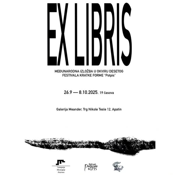 У петак, 26. септембра од 19 часова у галерији Меандер ће бити уприличено свечано отварање Међународне изложбе графика „Ex Libris“. Ове године на конкурс је своје радове послало 45 аутора из 15 различитих земаља широм света.