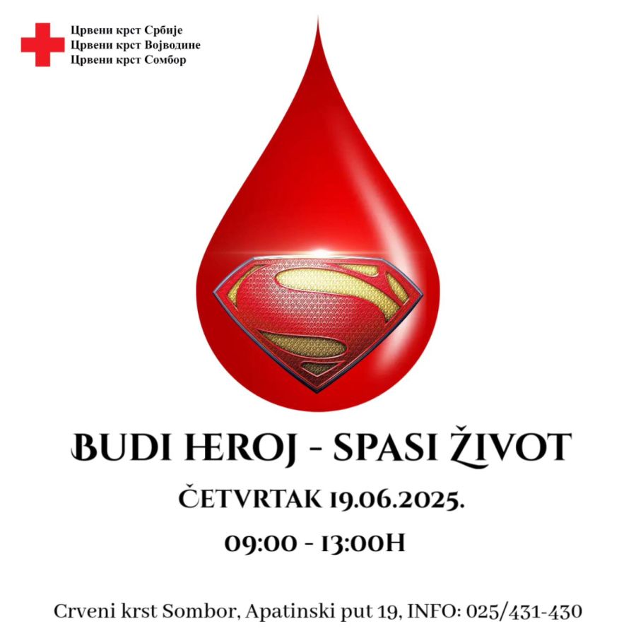 Црвени крст из Сомбора у сарадњи са Заводом за трансфузију Војводине организоваће у четвртак, 19. јуна још једну акцију добровољног давања крви.