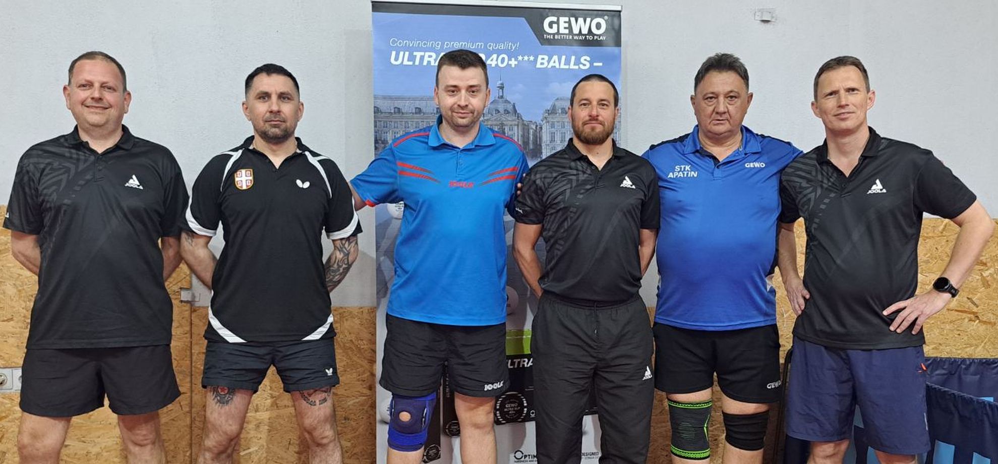 Сусрет је отворио капитен Богдан Цвјетићанин сигурном победом од 3:0, по сетовима 12:10, 11:4 и 11:7, чиме је Апатин повео са 1:0. У другом мечу, Ранко Цвијановић се суочио са знатно јачим противником, али је успео да освоји један сет. Меч је завршен резултатом 1:3 (5:11, 11:7, 5:11, 5:11), па је резултат изједначен на 1:1. Трећи меч донео је праву драму – Владо Ковчин је након велике борбе славио резултатом 3:2 (11:9, 6:11, 11:8, 10:12, 13:11) и вратио предност Апатину – 2:1. У дублу су снаге удружили Цвјетичанин и Ковчин и донели нови бод Апатину победом од 3:1 (11:8, 4:11, 11:7, 13:11), за вођство од 3:1. У четвртом појединачном мечу, Цвјетићанин није успео да донесе одлучујући бод, па је противник смањио резултат на 3:2.