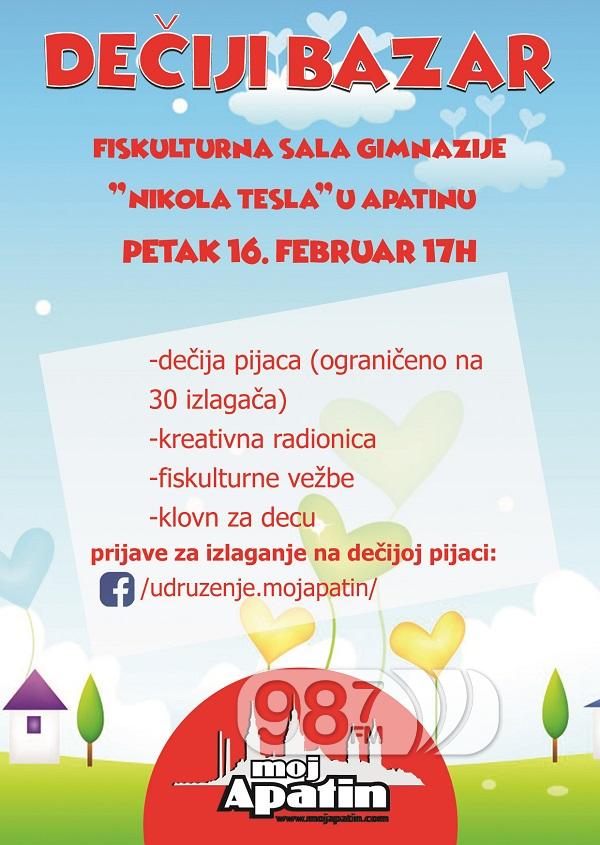 U fiskulturnoj sali gimnazije “Nikola Tesla” 16. februara sa početkom od 17 sati održaće se svojevrsna dečija manifestacija na kojoj će biti organizovana dečija pijaca, kreativne radionice, prezentacije fiskulturnir vežbi, klovnovska predstava i još mnogo toga.