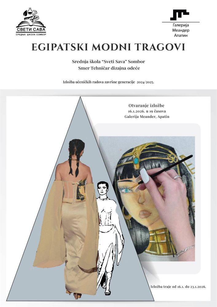 “Са задовољством најављујемо отварање изложбе „Египатски модни трагови“, која представља наставак успешне сарадње Средње школе „Свети Сава“ Сомбор и Градског музеја Сомбор, започете кроз модну ревију реализовану у музејском простору. Изложба обухвата скице и модне креације ученика завршне године 2024/25. образовног профила Техничар дизајна одеће и пружа увид у процес – од идеје која повезује цртеж, тканину и савремени модни израз, инспирисан симболиком древног Египта.”