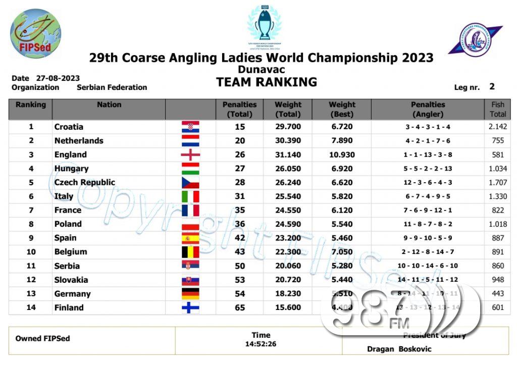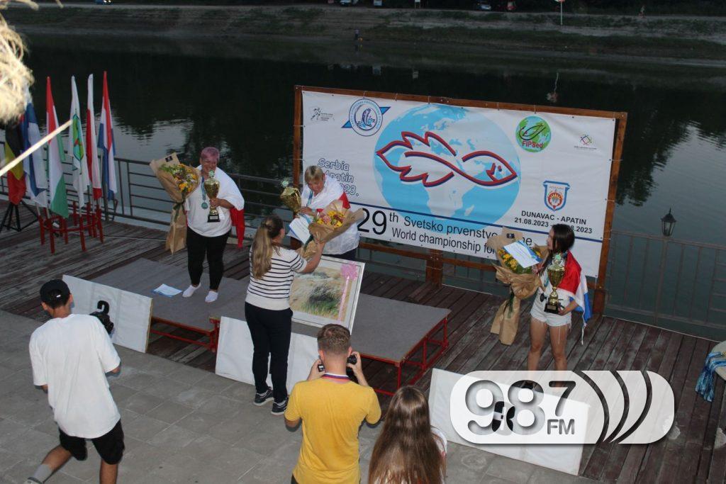 Свечаном церемонијом и доделом пехара, на тераси ресторана “Плава ружа”, јуче је у Апатину завршено 29. Светско првенство у риболову на пловак за даме. У заливу Дунава код Апатина надметало се четрнаест репрезентација, а свака од њих је имала по пет такмичарки. Након дводневног такмичења прво место у екипној конкуренцији освојила је репрезентација Хрватске, друга је Италија, а трећа репрезентација Пољске.