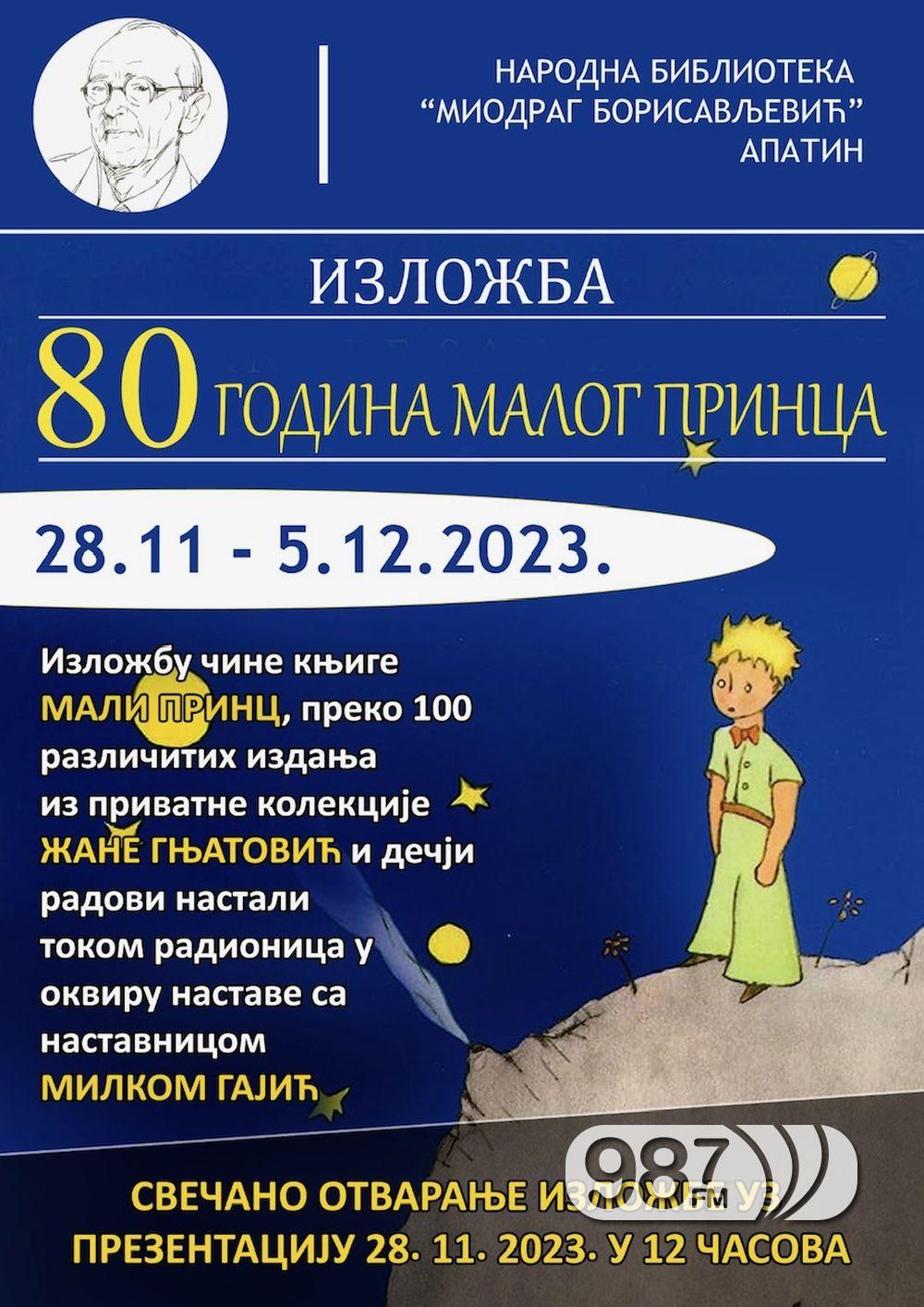 У уторак 28. новембра 2023. године са почетком у 12 сати, у апатинској библиотеци „Миодраг Борисављевић“ (одељење за одрасле) биће отворена изложба уз презентацију „80 година Малог принца“ Антоана де Сент Егзиперија.