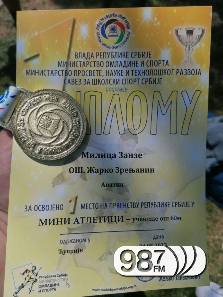 На Републичком такмичењу у атлетици које је одржано данас, 24. маја у Ћуприји, Основну школу “Жарко Зрењанин” из Апатина је представљала Милица Занзе, која је у трци на 60 метара освојила прво место и постала школски првак државе.