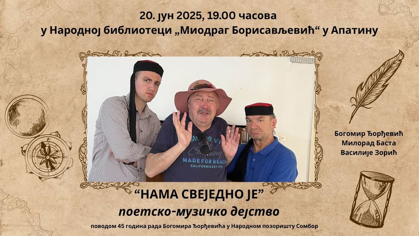У Народној библиотеци “Миодраг Борисављевић” у Апатину сутра, 20. јуна са почетком у 19 сати, одржаће се поетско-музичко дејство поводом 45 година рада глумца Богомира Ђорђевића у Народном позоришту Сомбор.