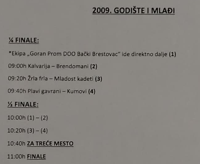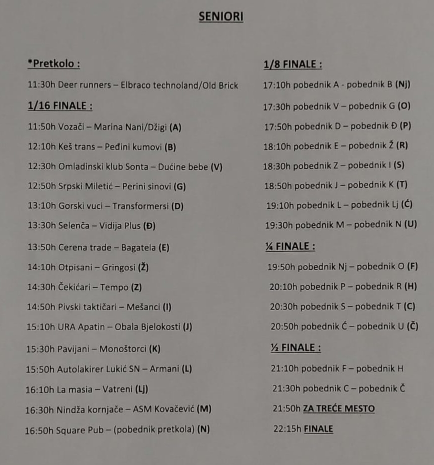 Након финалног дуела млађе категорије, у 11.30 часова ће почети надметање сениора који такође играју по куп систему. Утакмице у апатинској спортској хали ће бити игране током читавог дана, а према пројекцији организатора полуфинала сениора би требала да почну нешто после 21 сат, док ће се о победнику турнира одлучивати сат времена касније.