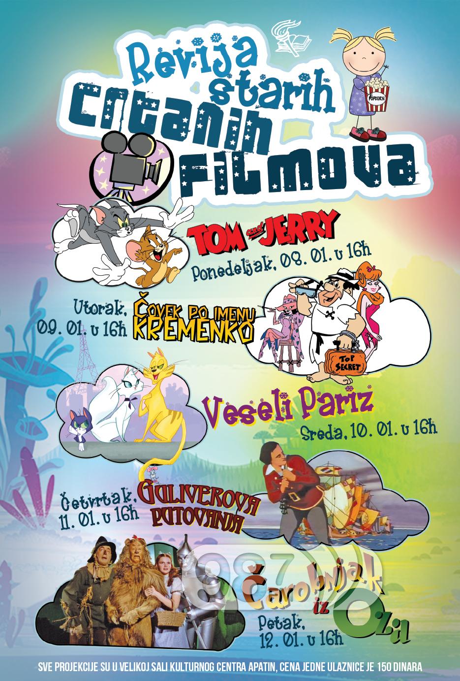 Kulturni centar iz Apatina u sardanji sa Turističkom organizacijom Apatin će od 8. do 12. januara organizovati reviju starih crtanih filmova, pa će tako apatinska publika imati priliku da pogleda “Tom i Džeri”, “Čovek po imenu Kremenko”, “Veseli Pariz”, “Guliverova putovanja” i “Čarobnjak iz Oza”.