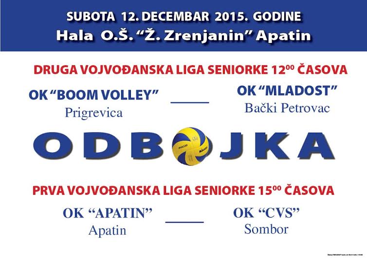 U poslednjem kolu jesenjeg dela prvenstva Prve Vojvođanske lige odbojkašice Apatina na svom terenu dočekuju CVS iz Sombora. Utakmica se igra u hali osnovne škole Žarko Zrenjanin sa početkom u 15 sati. Pre ove utakmice odigraće se utakmica predposlednjeg kola Druge Vojvođanske lige u kojoj će odbojkašice Boom Volleya iz Prigrevice kao domaćini ugostiti ekipu Mladost iz Bačkog Petrovca. Utakmica počinje u 12 sati.