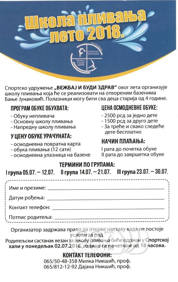 Roditeljski sastanak vezan za školu plivanja biće održan u Sportskoj hali u ponedeljak 02. jula sa početkom od 18 sati.