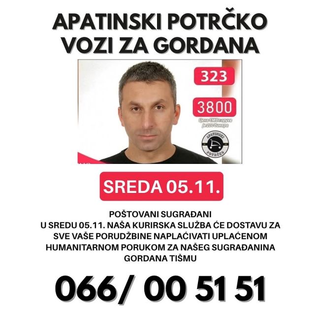 Како су најавили из курирске службе “Апатински потрчко”, у среду 5. новембра ова служба организију хуманитарну акцију за нашег суграђанина Гордана Тишму.