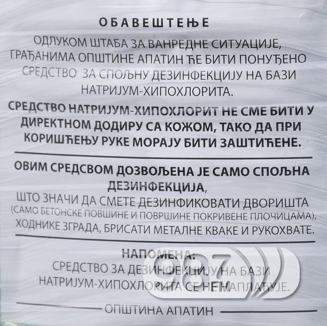 Свим домаћинствима у насељеним местим општине Апатин сутра креће подела дезинфекционог средства – натријум хипохлорита. Подела почиње у 8.30 у Сонти и наставља се током дана у Свилојеву, Пригревици и Kупусини.