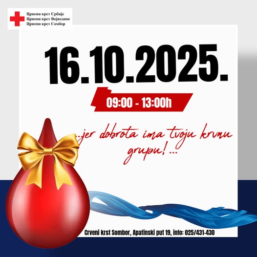 Црвени крст Сомбор у сарадњи са Заводом за трансфузију крви Војводине, у четвртак 16. октобра, организује редовну акцију добровољног давања крви.