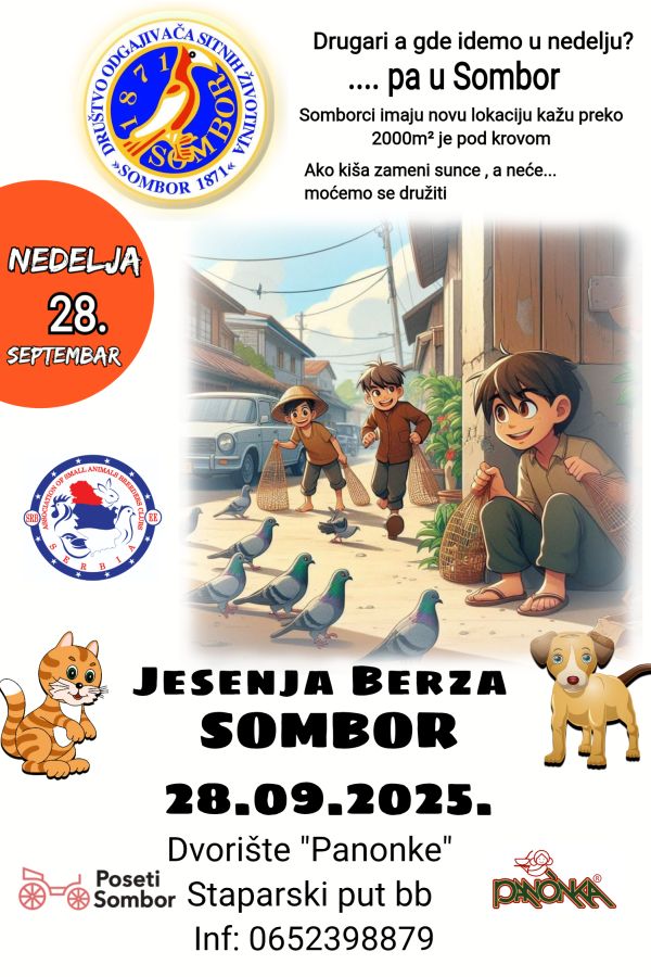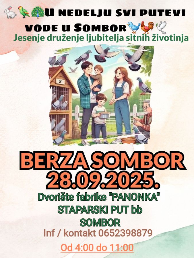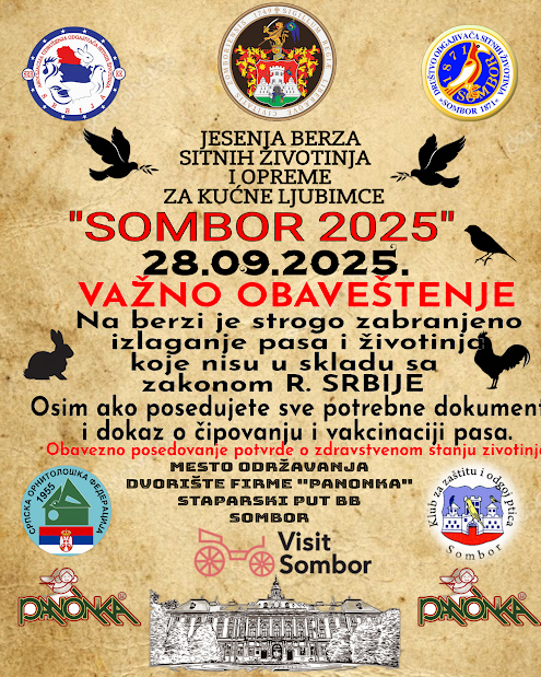 Друштво одгајивача ситних животиња „Сомбор 1871“ организује Јесењу берзу ситних животиња у Сомбору у недељу 28. септембра 2025.