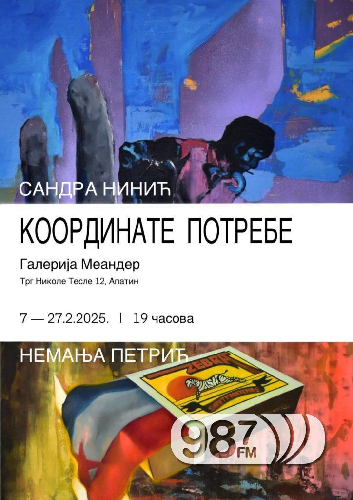 У апатинској Галерији “Меандер” у петак 7. фебруара 2025. године са почетком у 19 сати ће бити отворена изложба уметника Немање Петрића и Сандре Нинић под називом “Координате потребе”.