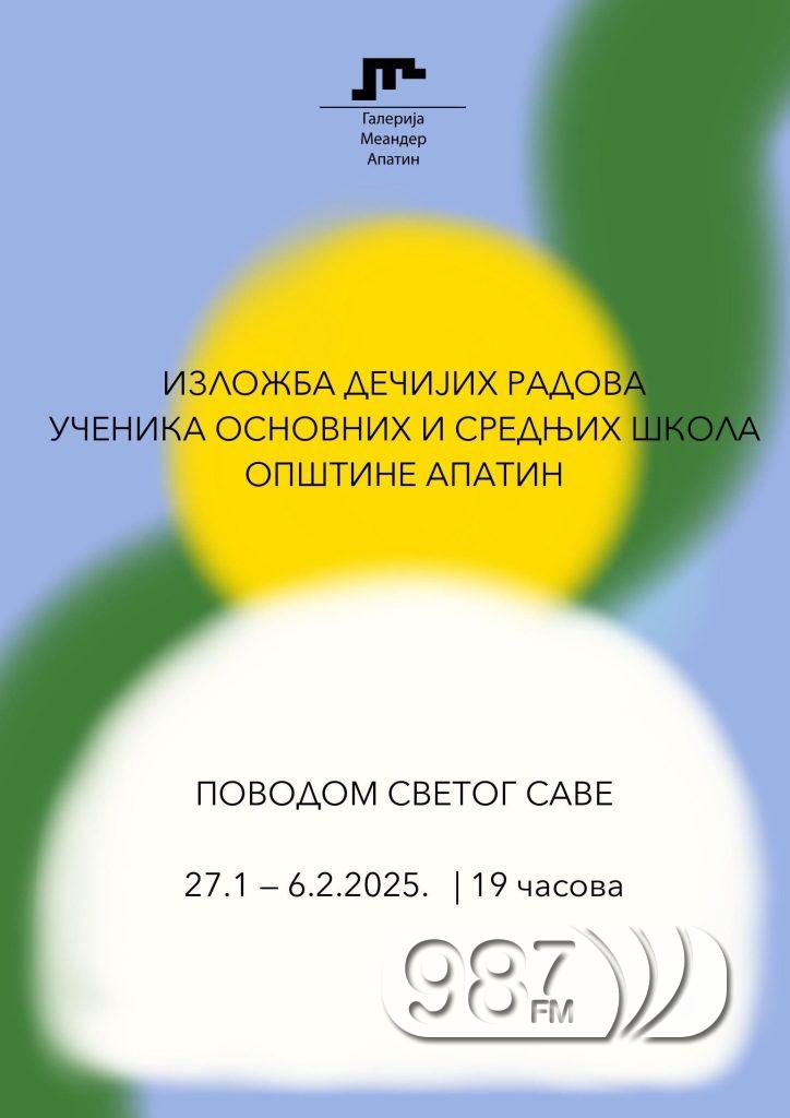 У понедељак 27. јануара 2025. године са почетком у 19 сати, поводом школске славе “Свети Сава” у апатинској галерији “Меанедер” биће уприличено свечано отварање овогодишње изложбе радова ученика основних и средњих школа апатинске општине.