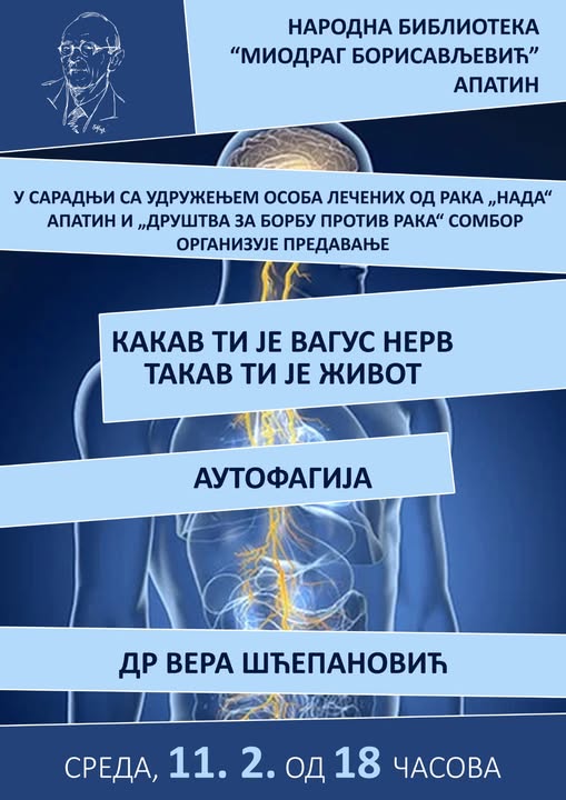 У среду 11. фебруара 2026. године у Народној библиотеци “Миодраг Борисављевић” са почетком од 18 сати биће одржано предавање др Вере Шћепановић, специјалисте инфектологије под називом “Какав ти је вагус нерв такав ти је живот”, АУТОФАГИЈА.