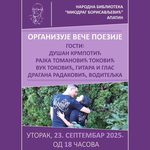 Народна библиотека “Миодраг Борисављевић” из Апатина, организује вече поезије у уторак, 23. септембра са почетком од 18 сати.