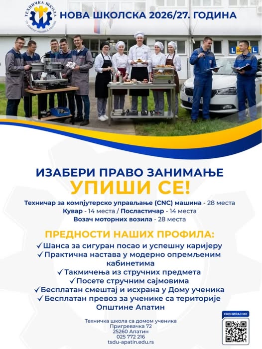 Техничка школа са домом ученика у Апатину расписала је упис за школску 2026/27. годину, нудећи будућим средњошколцима више атрактивних и тражених образовних профила.
