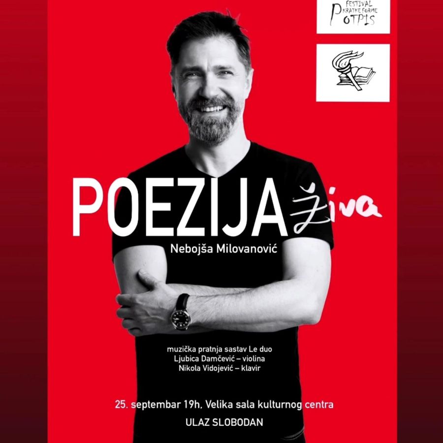 Другог дана Фестивала кратке форме „Потпис“ вечерас са почетком у 19 сати у Великој сали Културног центра биће уприличено поетско-музичко вече од 19 сати под називом „Поезија жива“, поетски монодрамски колаж састављен од поезије великана литературе са темама љубави, живота, смрти, обогаћен снагом класичне музике коју на сцени изводе клавир и виолина. Поетски одабир је у режији глумца Небојше Миловановића чија је матична кућа Југословенско Драмско Позориште. Небојша уверљиво уноси радост у сусрету са најдубљим емоцијама, истинама и бисерима класике.